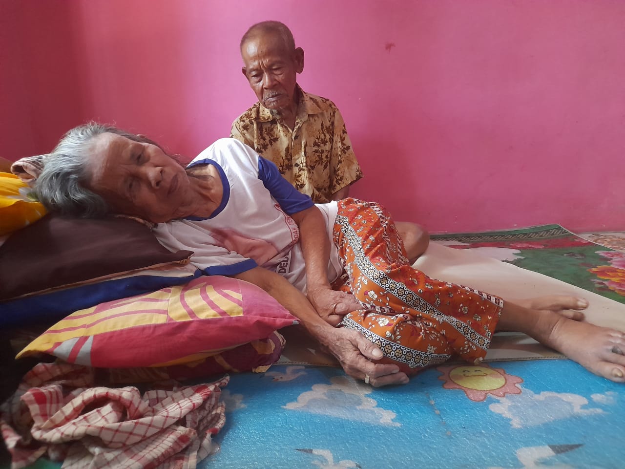 His wife suffers from a stroke and can no longer walk. Parts of her body are stiff and unable to move. Grandma can only lie weakly inside their small home.