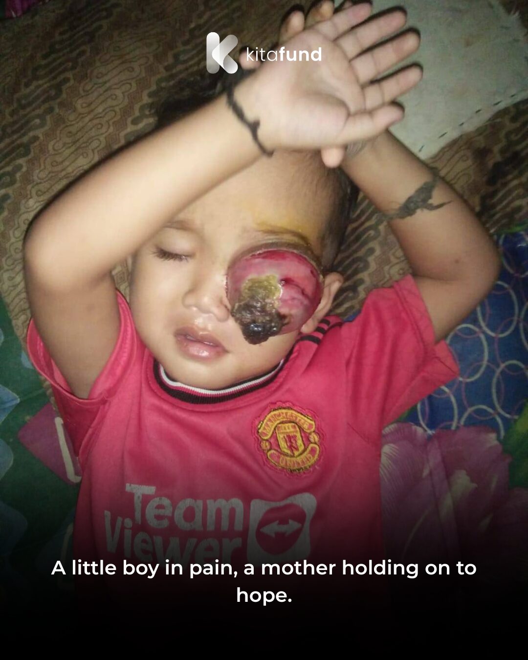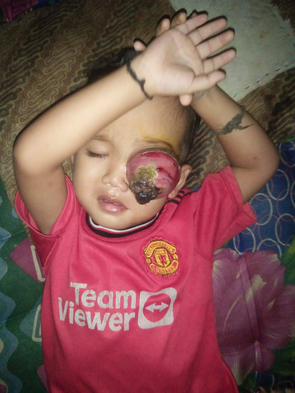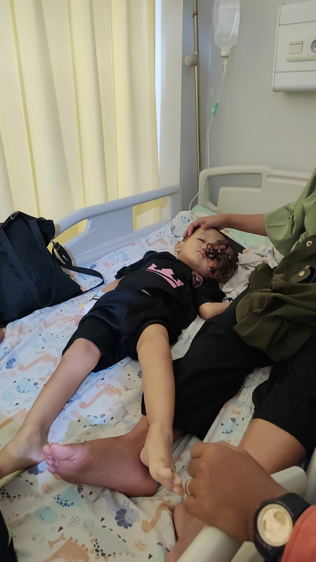 Now, each time he cries, blood seeps from the corner of his eye, and his mother can only hold him tightly, whispering prayers while trying to hide her tears. The tumor has grown so large that it covers part of his face, often causing burning pain and unbearable itching. Doctors say surgery is the only hope to stop the tumor from spreading and save his future.