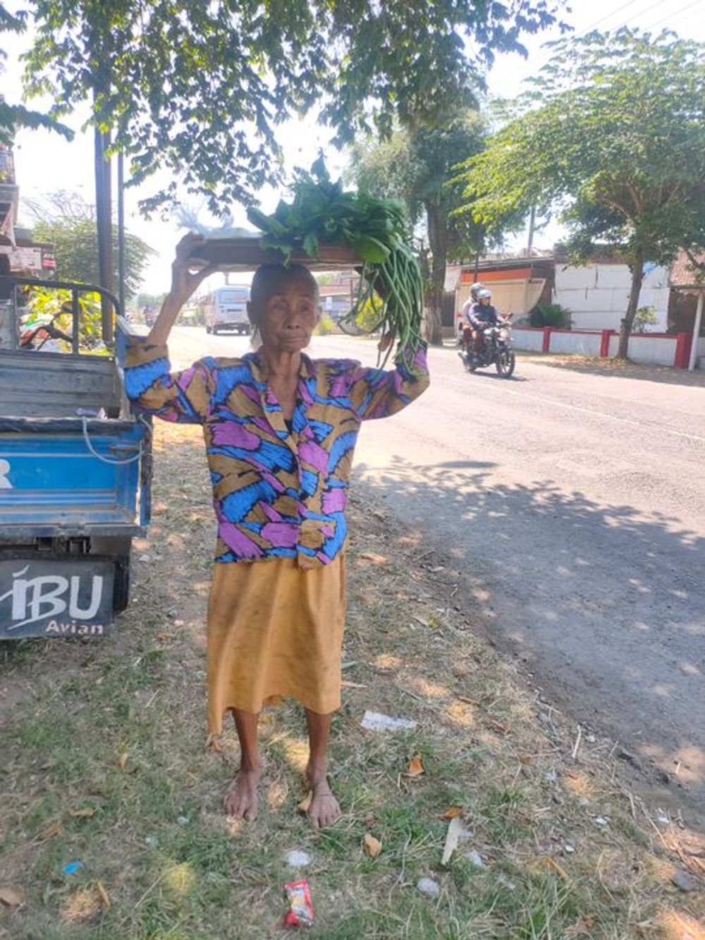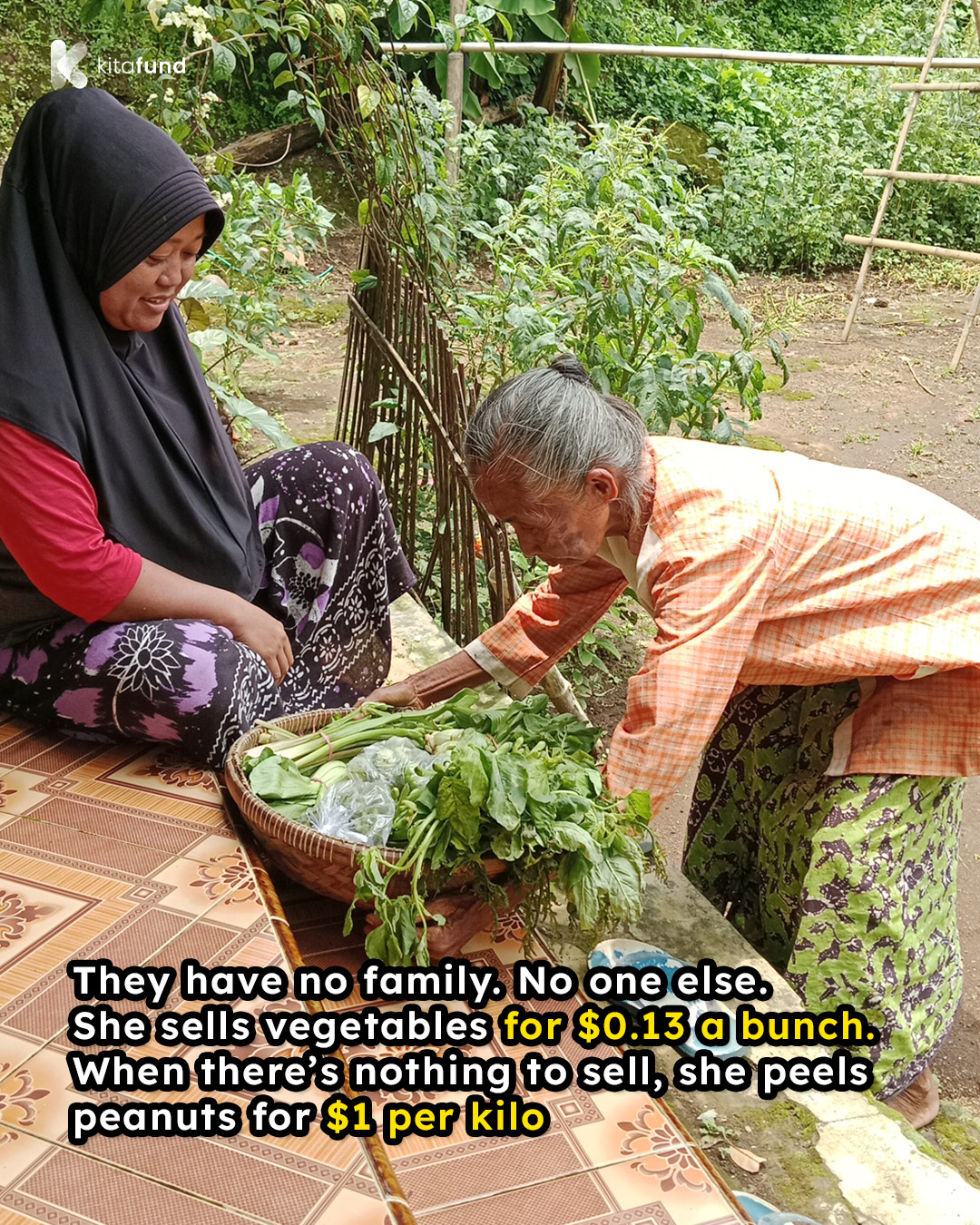 To earn a living and care for her sister, Mbah Buya sells vegetables door-to-door—harvested from the small garden around their home. She earns about $0.13 per bundle, and if everything sells, she brings home roughly $1.30 a day—just enough to buy rice and a simple meal. On days when there are no vegetables to sell, she works as a peanut peeler, earning around $0.98 per kilogram.