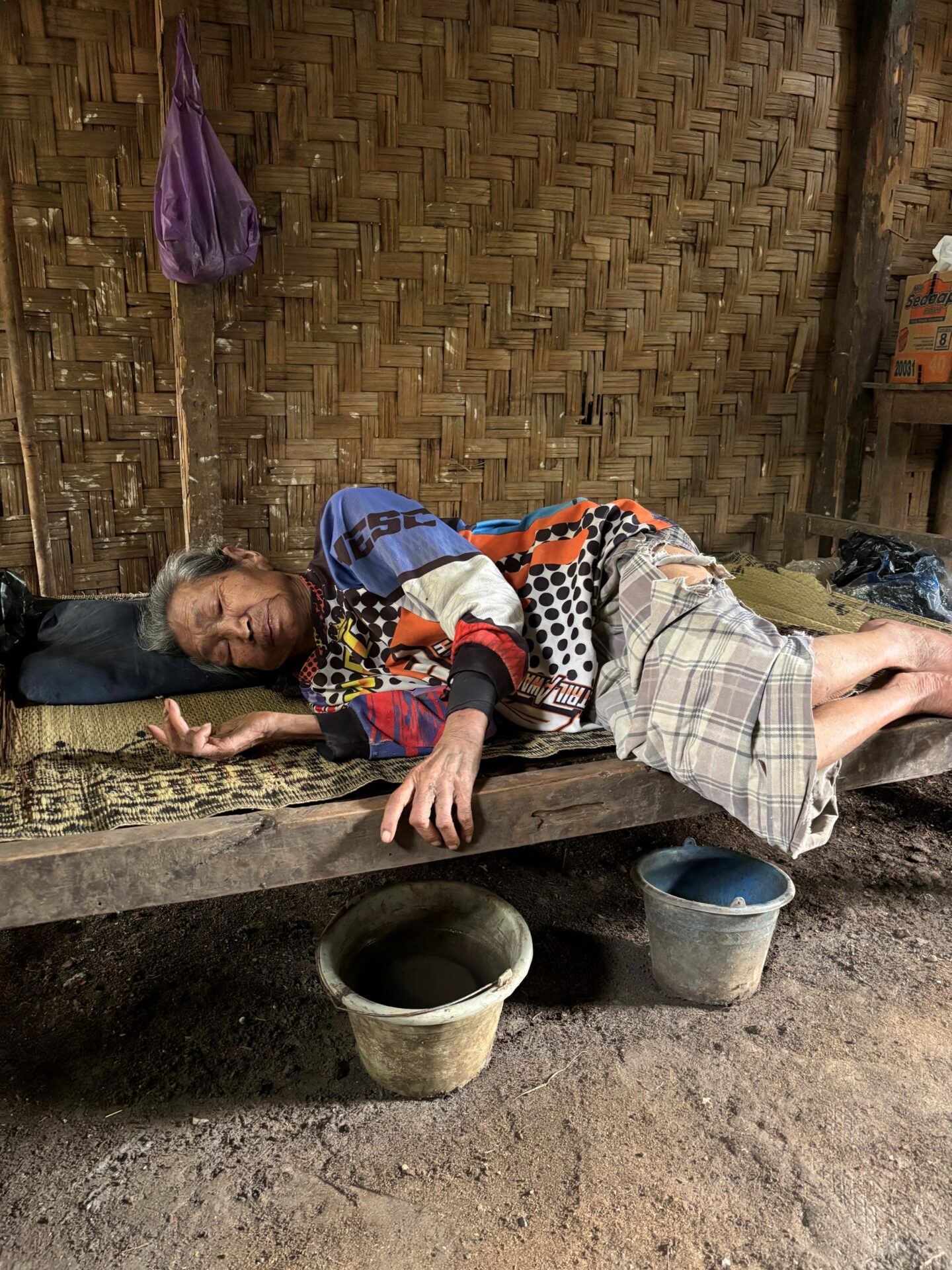 Her condition has caused her frail body to grow weaker. The little food she eats has almost no nutrition. She spends her days lying on a bamboo bed without a mattress, unable to move freely.