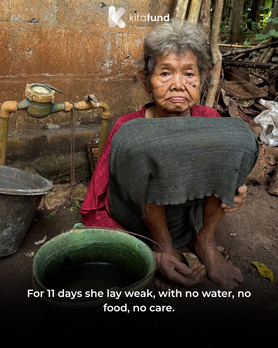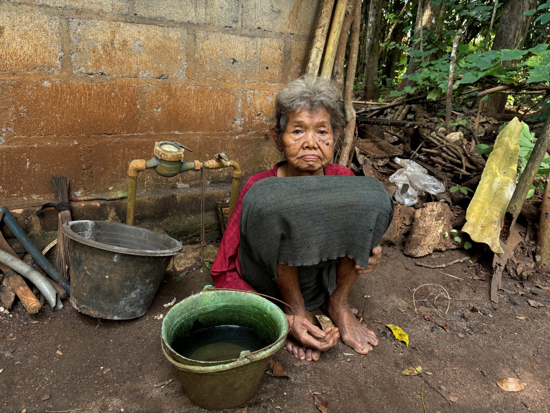 “I’m just waiting for the rain to fall… so I can have some water to drink,” whispered Grandma Ngapinah (72) as she sat weakly in front of her old wooden house deep in the forest.