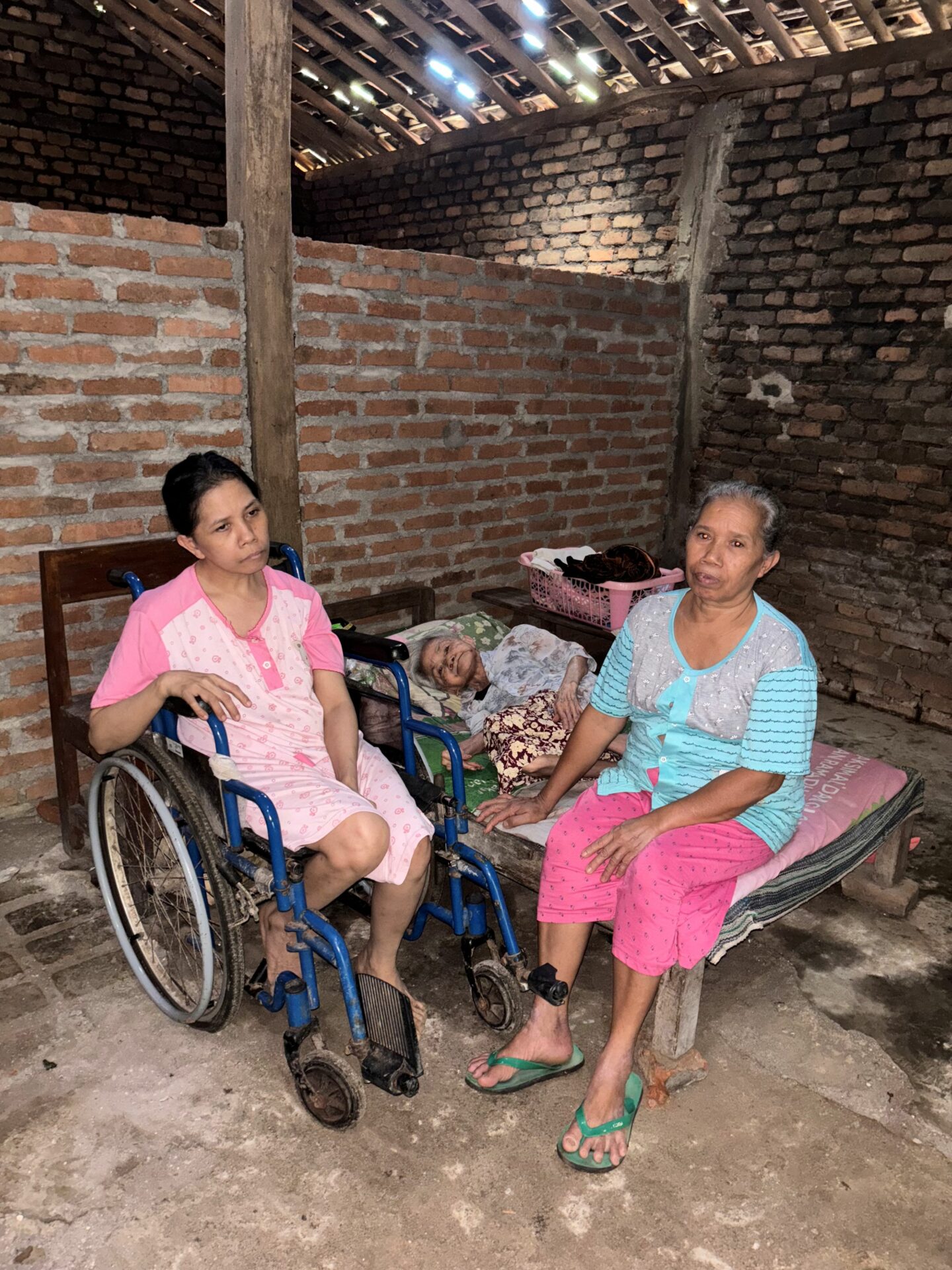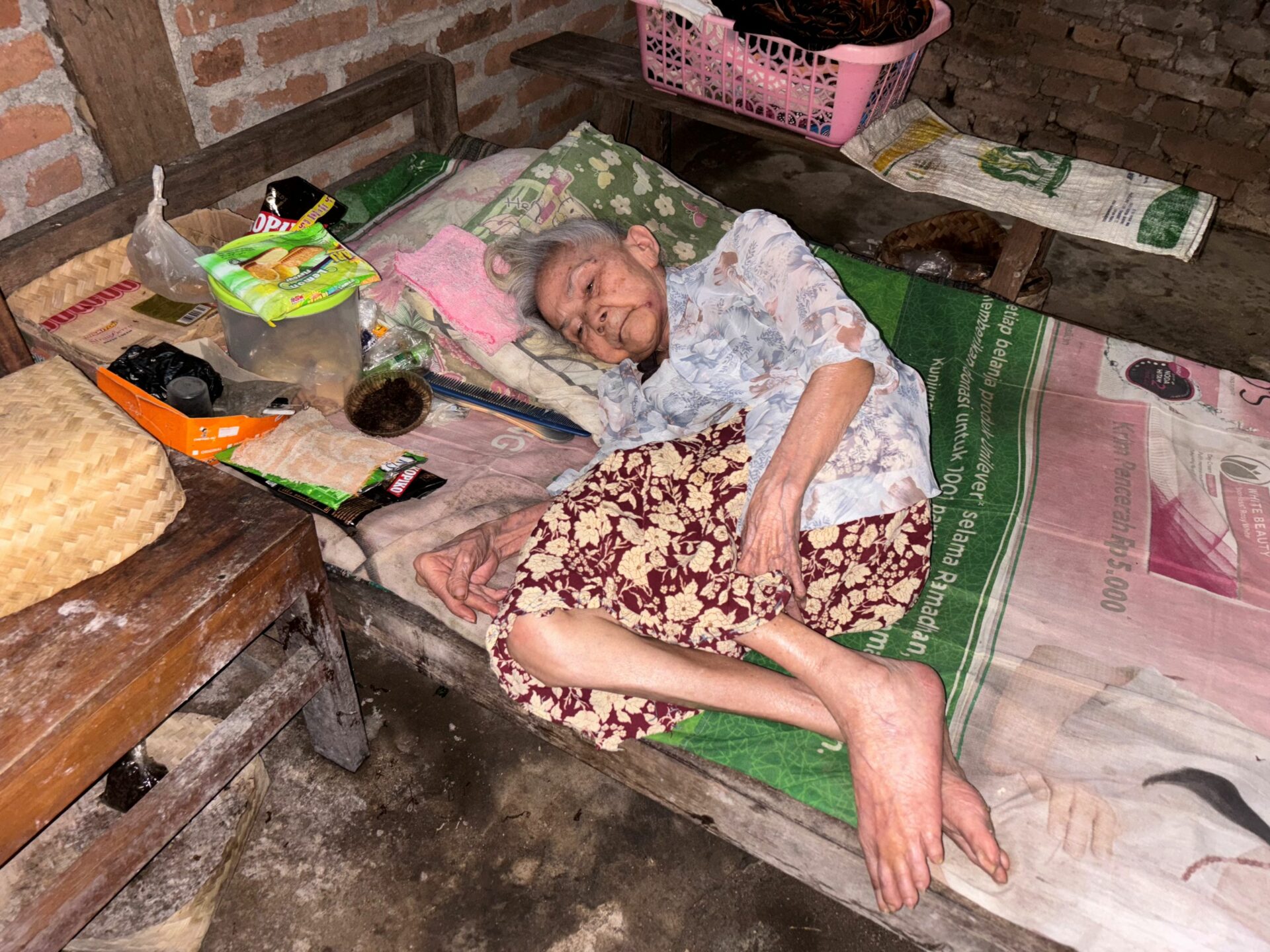 At 61 years old, Grandma Timah has devoted her entire life to caring for her 79-year-old mother, Grandma Sadiyem, who has been paralyzed for ten years due to a stroke, and her 45-year-old sister, Sumarti, who suffered brain damage after childbirth, leaving her unable to stand or speak and often suffering from seizures.
