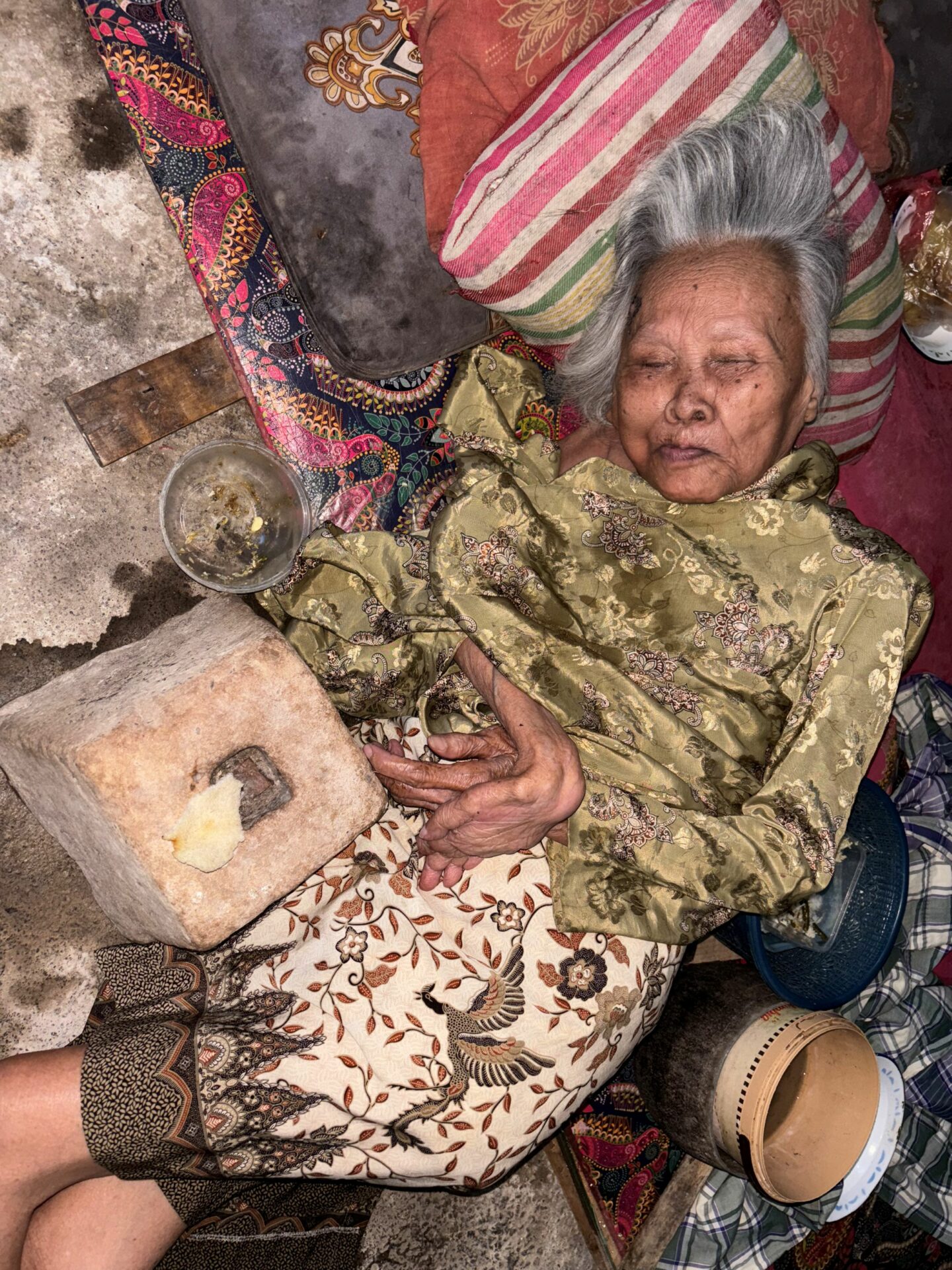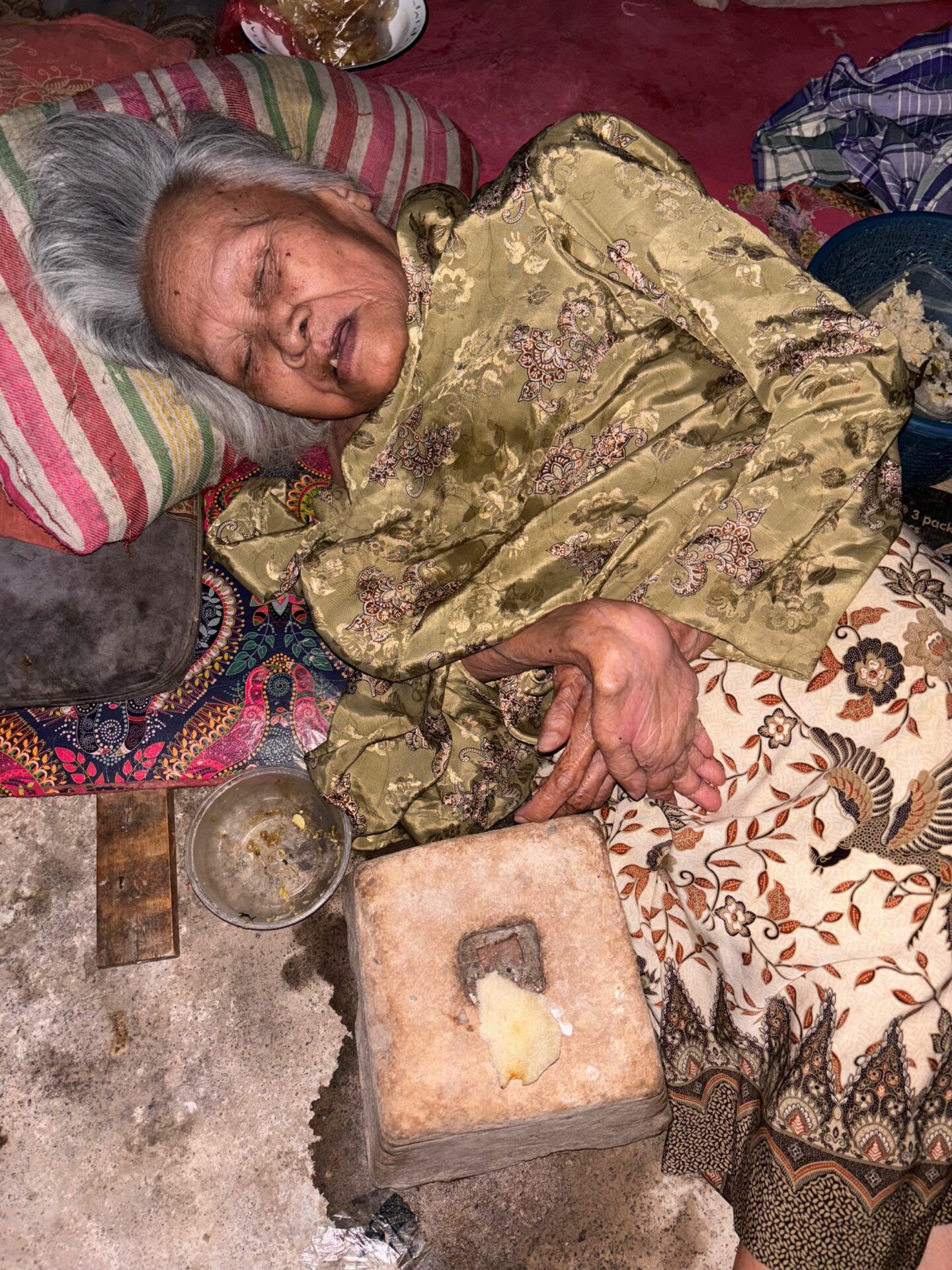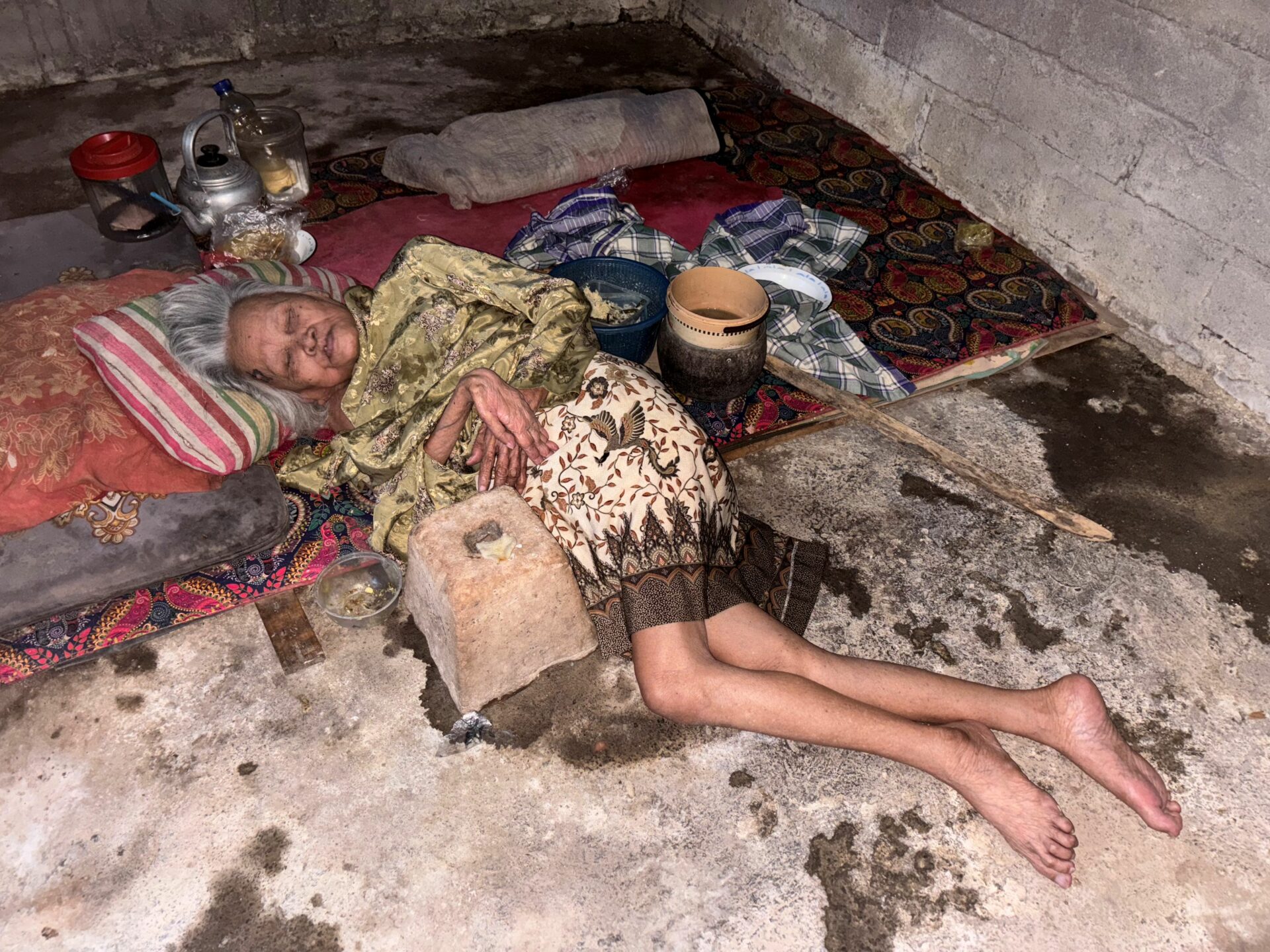 Warsi, 77, has been living completely alone since losing both parents decades ago. Blind and paralyzed, she can no longer move on her own. Two years ago, she could still shift herself by crawling, but now she is confined to lying down, unable even to change position.