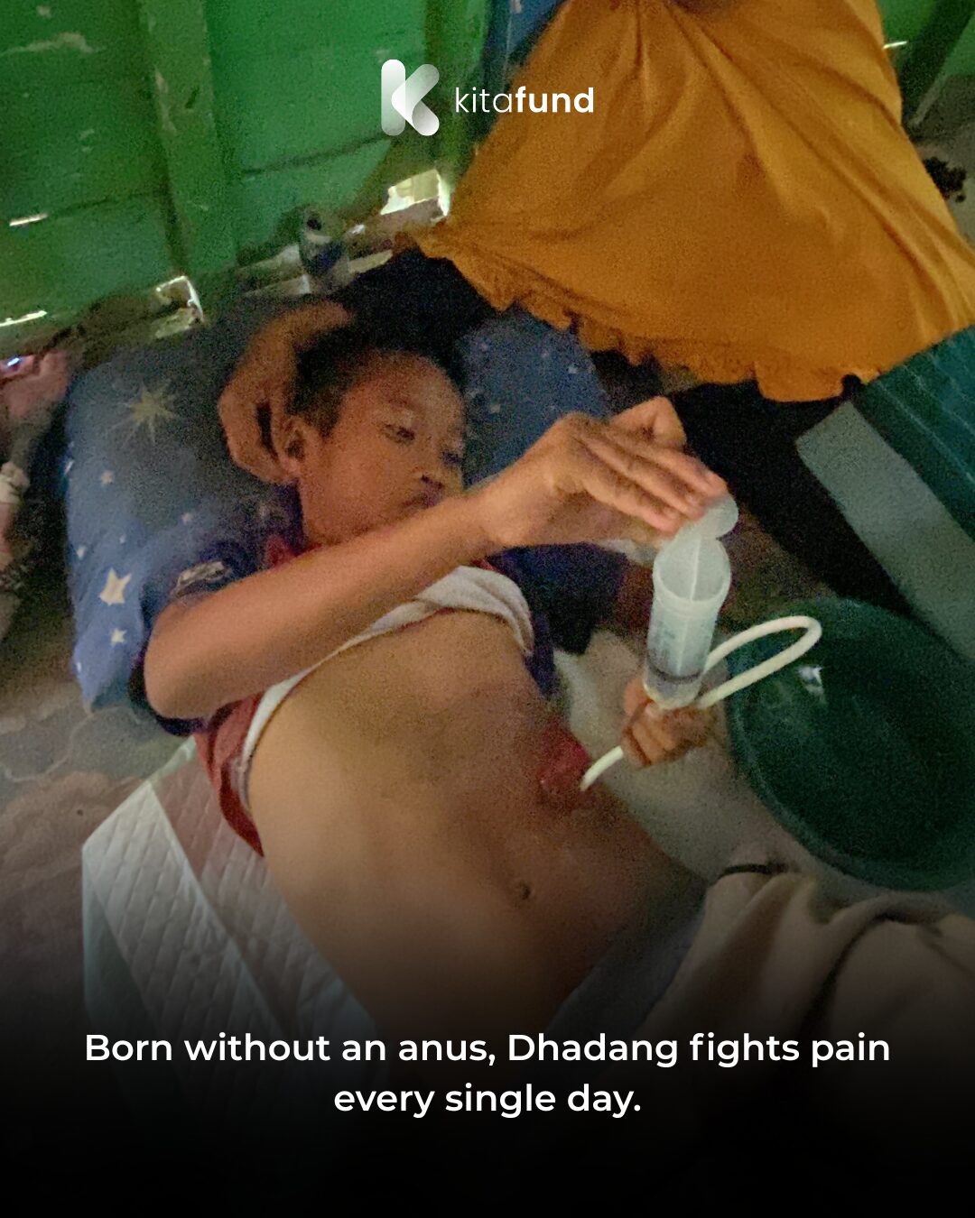 Despite his innocent smile, Dhadang carries an unimaginable burden. He needs surgery to reconstruct his digestive system — a procedure that could finally allow him to live and grow like any other child. But the cost of treatment and care is far beyond what his mother can afford, reaching thousands of dollars.