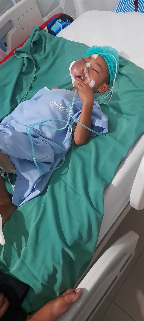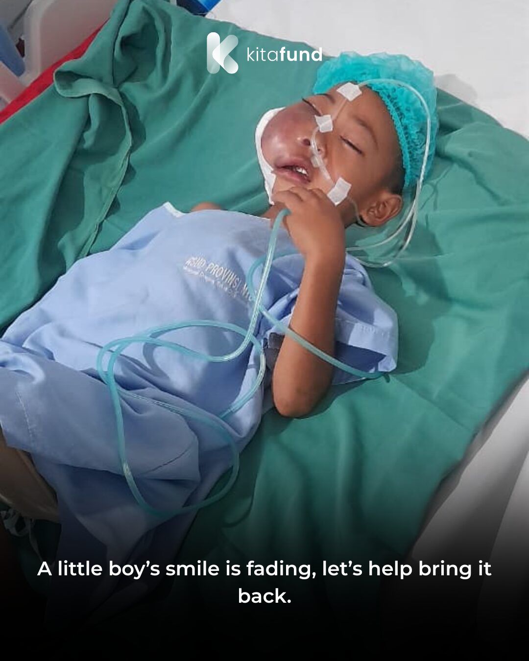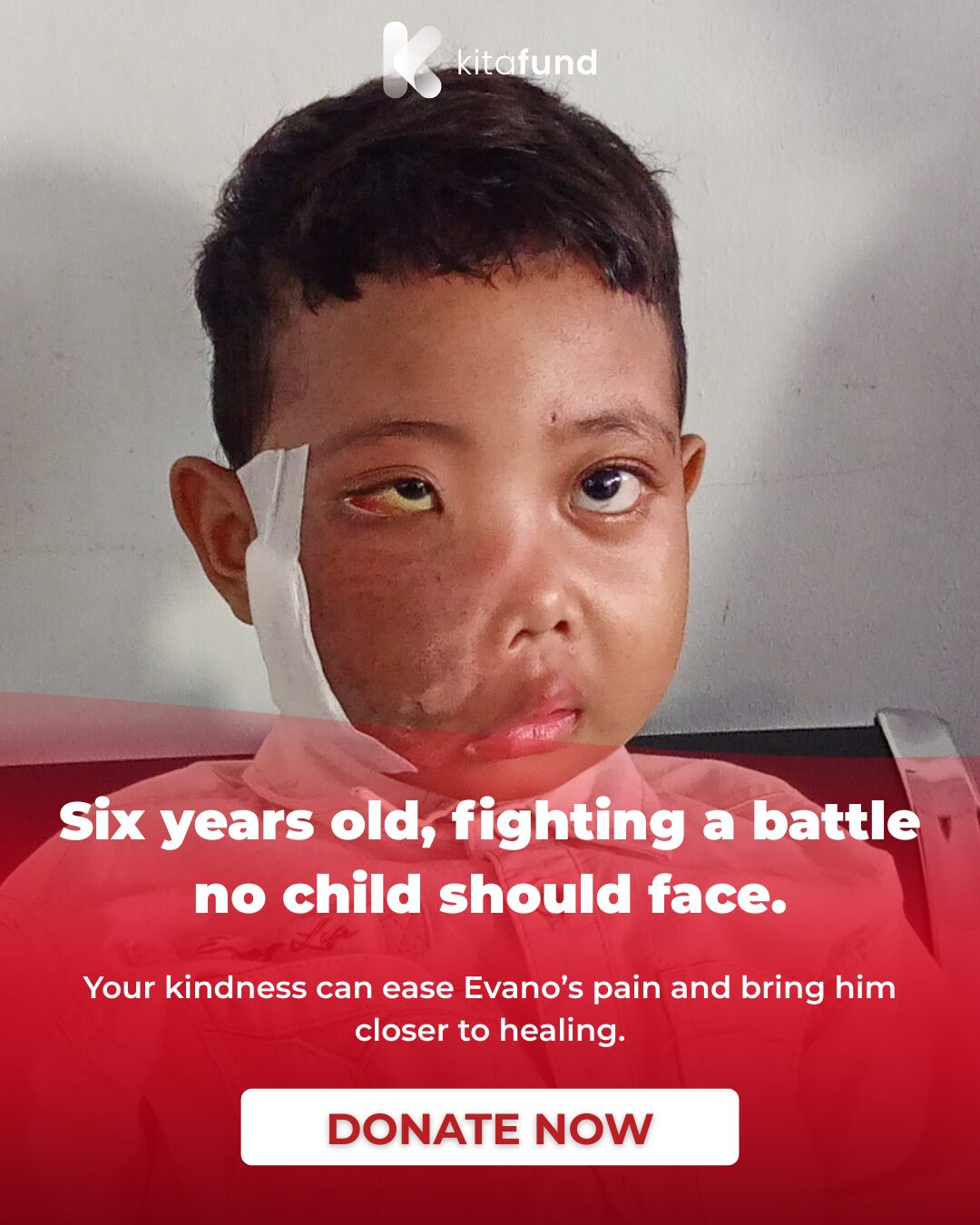 The tumor has grown rapidly, bringing unbearable pain and making it difficult for him to eat, sleep, or even smile. Evano needs continuous medical treatment, but the journey to the hospital is long and exhausting. Each time he has a check-up, his parents must travel many kilometers by motorcycle, a trip that leaves Evano in tears because of the pain.