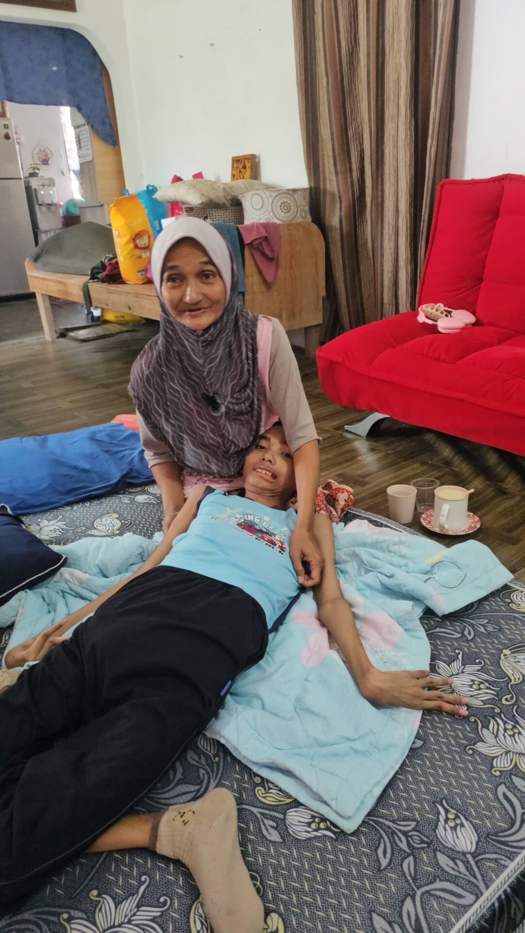 As a mother, Madam Salinah often sheds tears in prayer, asking for strength to care for her beloved son. “I feel so sad because my son is not like other children,” she said with a trembling voice. Their efforts never ceased. At the age of seven, Iman was enrolled in Community-Based Rehabilitation for training until he turned 12. But now, training can only be done at home due to financial constraints.