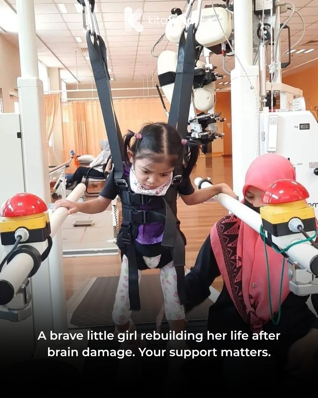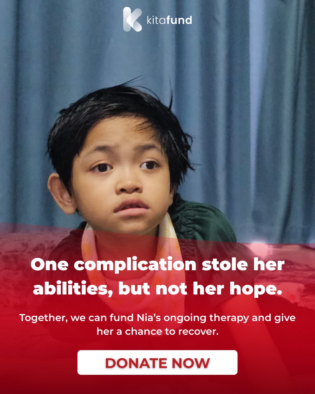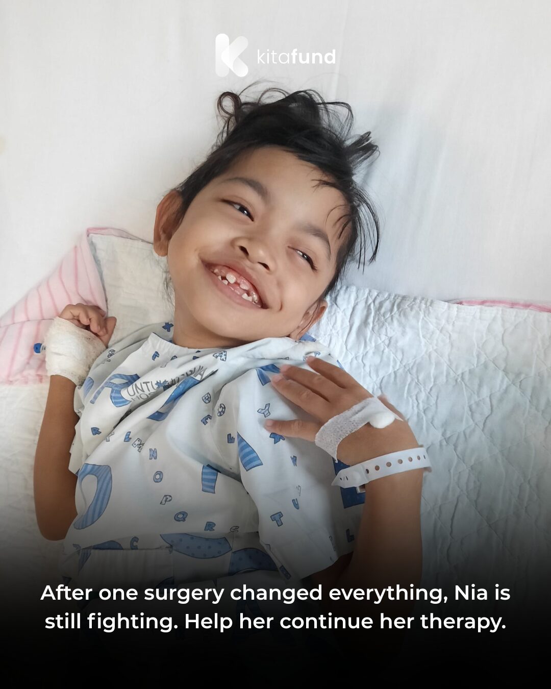 There is progress, but recovery is still far away. Nia still cannot stand or walk, and all her food has to be blended. She needs ongoing therapy, medical care, and constant support to continue improving.
