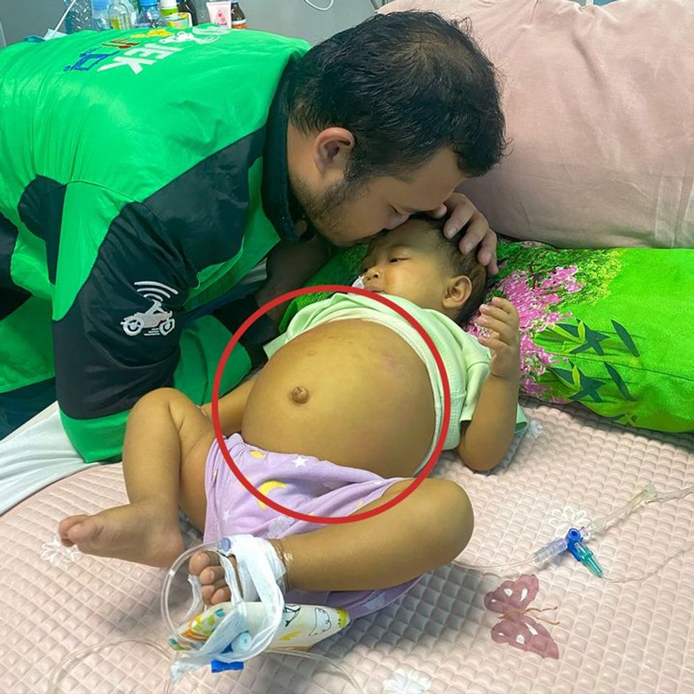 This condition is extremely rare, only 1 in 15,000 babies suffer from it! Yuna’s bile duct is severely damaged and only functions at 20%. Her tiny belly is also dangerously swollen. Now, Yuna urgently needs a liver transplant and long-term treatment just to survive. But where could the money come from? Despite working almost 24 hours non-stop, Rifqi cannot possibly afford the hundreds of millions needed for surgery…