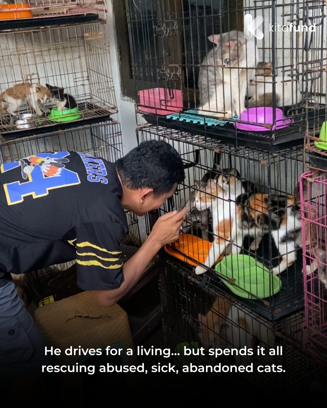 Mr. Hendra, an online motorcycle taxi driver, spends most of his modest income rescuing suffering cats.