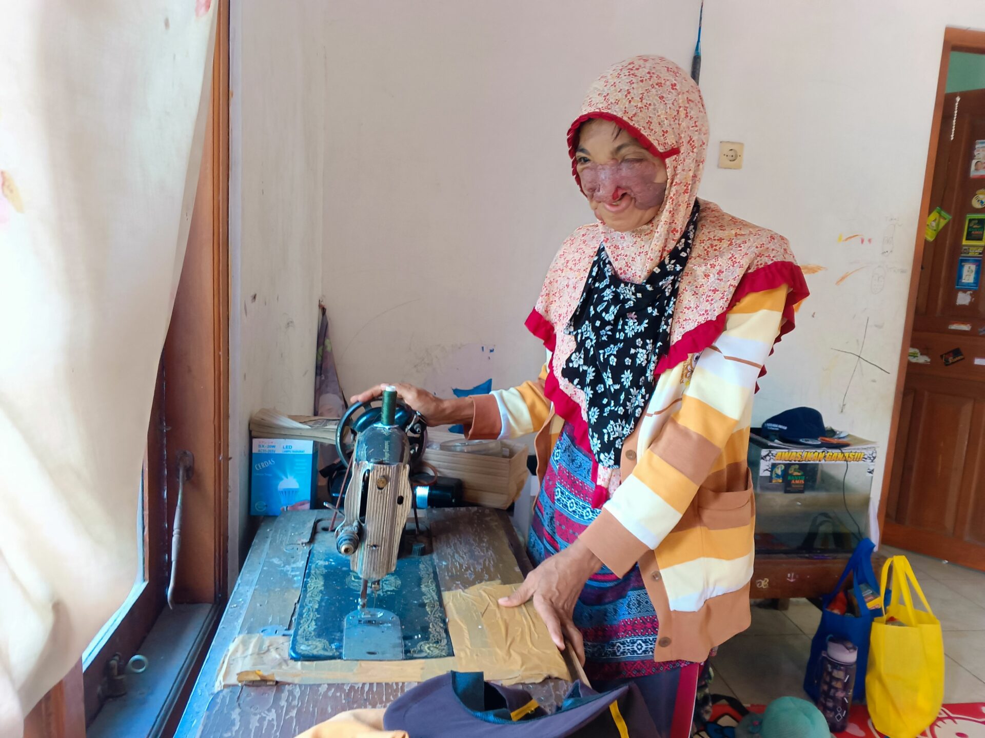 Her struggle grows heavier each day. Her sewing machine — her only source of income — is now broken. Still, she refuses to give up, trying to repair it herself so she can continue working.