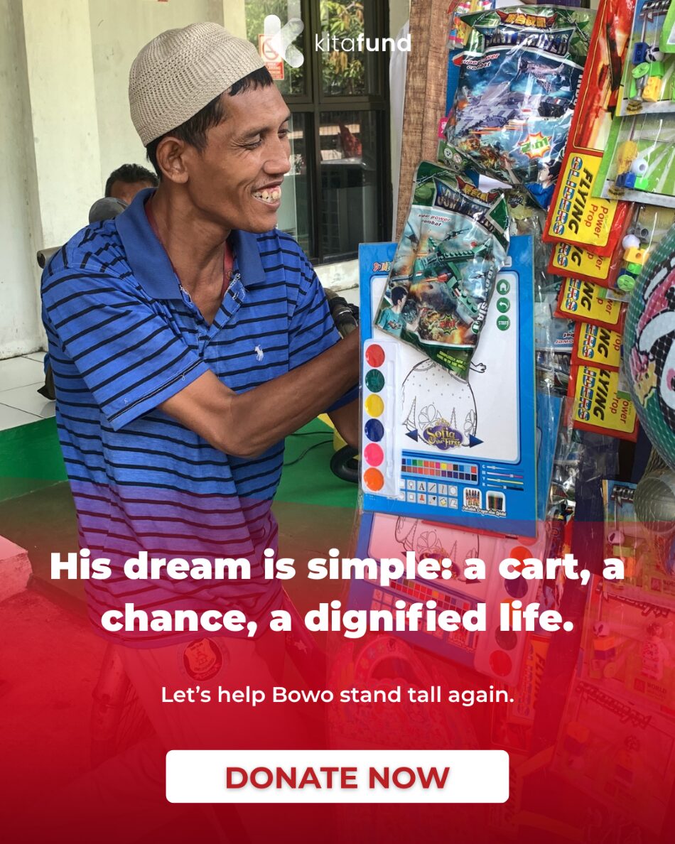 Bowo dreams simply: a proper cart and a little extra capital so he can sell more, attract more customers, and live a better life without constant hunger.