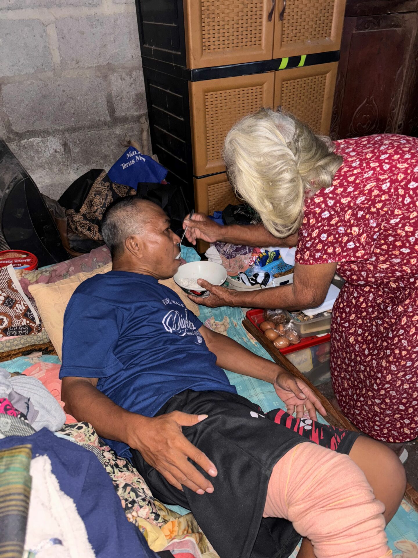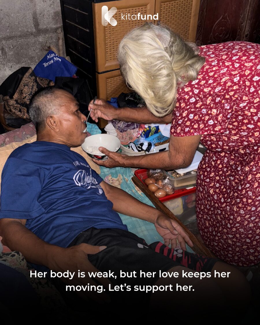 At home, her son — Pak Arifin — can only lie down. His leg broke after he fell into the river while fishing. The wound became infected after surgery, and he now needs another medical procedure. Sadly, his leg has only been wrapped with cloth for a long time. We worry that if left untreated, the infection may worsen…