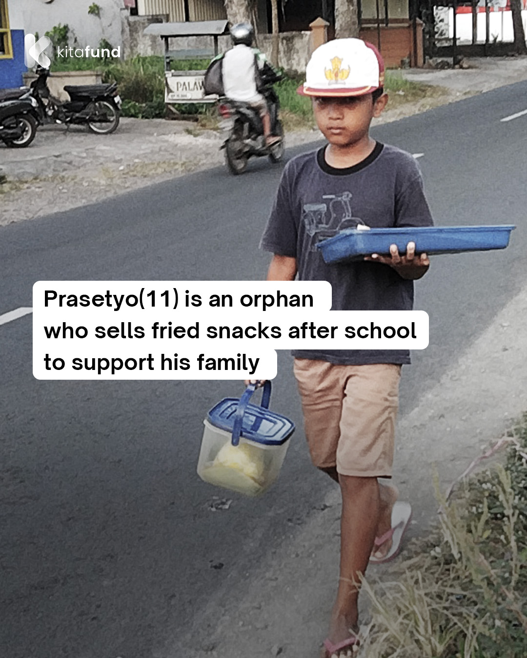 At the age of just 11, Prasetyo has become the backbone of his family. After losing his father a year ago, Prasetyo now takes responsibility for providing for his family’s daily needs. Every day, after school, Prasetyo sells fried snacks around the neighborhood.