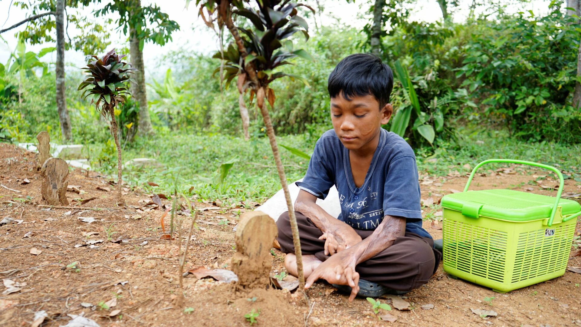 Every afternoon, he visits his mother’s grave. He sits quietly, as if sharing the stories he cannot tell anyone else. His grandmother watches him grow with both pride and sorrow, wishing he could undergo surgery to ease his pain and help him move more freely.